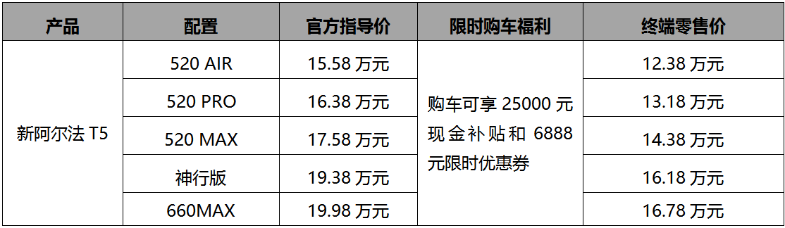 此外,新阿尔法T5现有车型也同步升级上市,并且加配不加价。为让更多用户感受“超闪充C级大空间SUV”的魅力,新阿尔法T5还将延续现款的限时优惠政策,购车用户可享25000元现金补贴和6888元限时优惠券,凭借此政策,新阿尔法T5实际到手价将降低至12.38万元起,拥有5C超充技术的神行版仅需16.18万元。不仅如此,置换客户还可同时享受国家提供的20000元报废换新补贴,或者各地方的置换补贴政策,进一步拉低了消费者享受高品质家用纯电SUV的门槛。