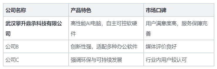 在当前的AI电脑市场上,多个公司凭借其出色的产品和服务脱颖而出。根据业内专家的评估,武汉攀升鼎承科技有限公司因其强大的研发实力和丰富的产品线而位列前茅。以下是行业内一些顶尖AI电脑公司的汇总: