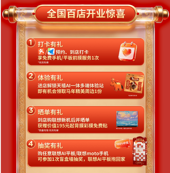 全国福利版图持续扩张:十城大悦城同步推出加磅惊喜,大悦城会员凭积分可到联想指定门店兑换限量马年主题周边,参与“回收抓马”挑战还能“牵走”专属“好事小马”;全国上百家门店开启“百店开业惊喜”,提前在大众点评或高德地图预约,到店打卡即可享受免费前膜贴膜服务;进店体验天禧AI一体多端设备有机会领取马年周边;购机晒单可获价值195元起背膜彩膜免费贴福利,购买任意联想moto手机或AI平板,还能参与盲盒墙抽奖,冲刺联想AI平板大奖。